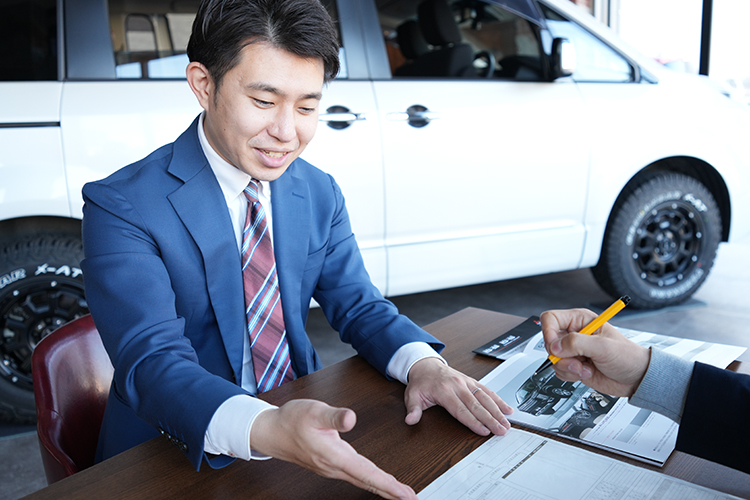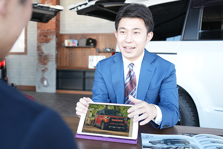 まずは、お客様の使用年数や家族構成の変化、ライフスタイル・現状の問題点等を丁寧にヒアリング。お客様の目線に立ち、クルマの販売を始めとする最適なカーライフプランをご提案します。また、クルマを販売した後も車検や点検などメンテナンスのご案内・クルマに関するアドバイス等を通して、お客様のカーライフをトータルでサポートしていきます。