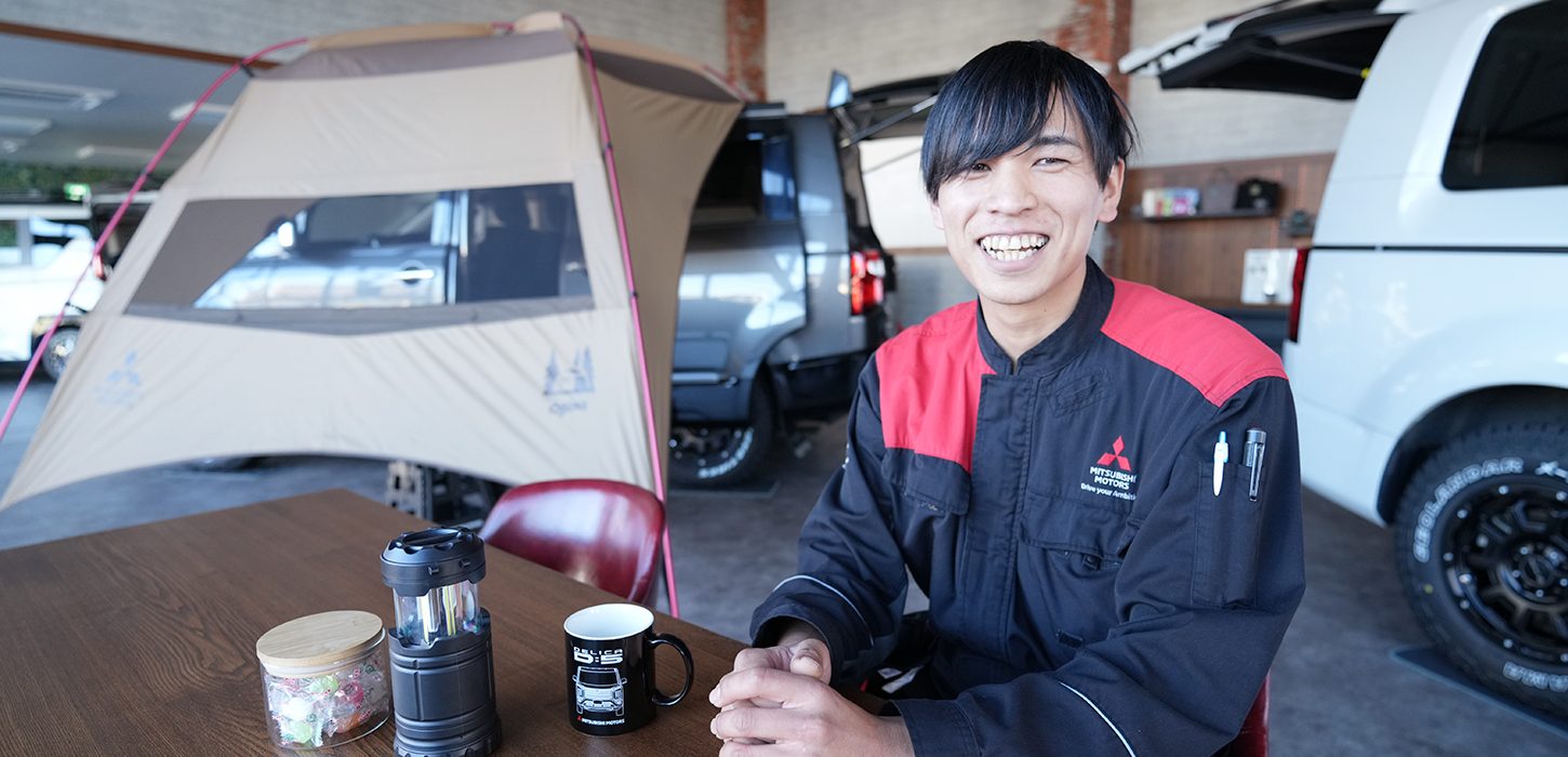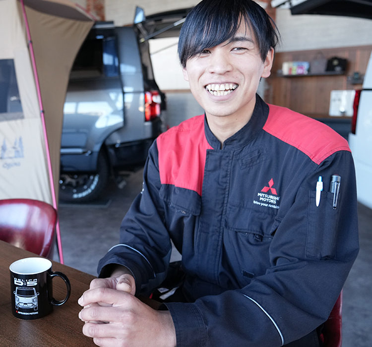 近年EV車が注目されているなか、国内EV車の先駆けでもある「I-MIVE」に興味を持ち、その車を整備したいと考え、三菱自動車への入社を視野に整備士になりました。その際、東海三菱には手厚い奨学金制度があることを知り、縁を感じ入社の決め手となりました。